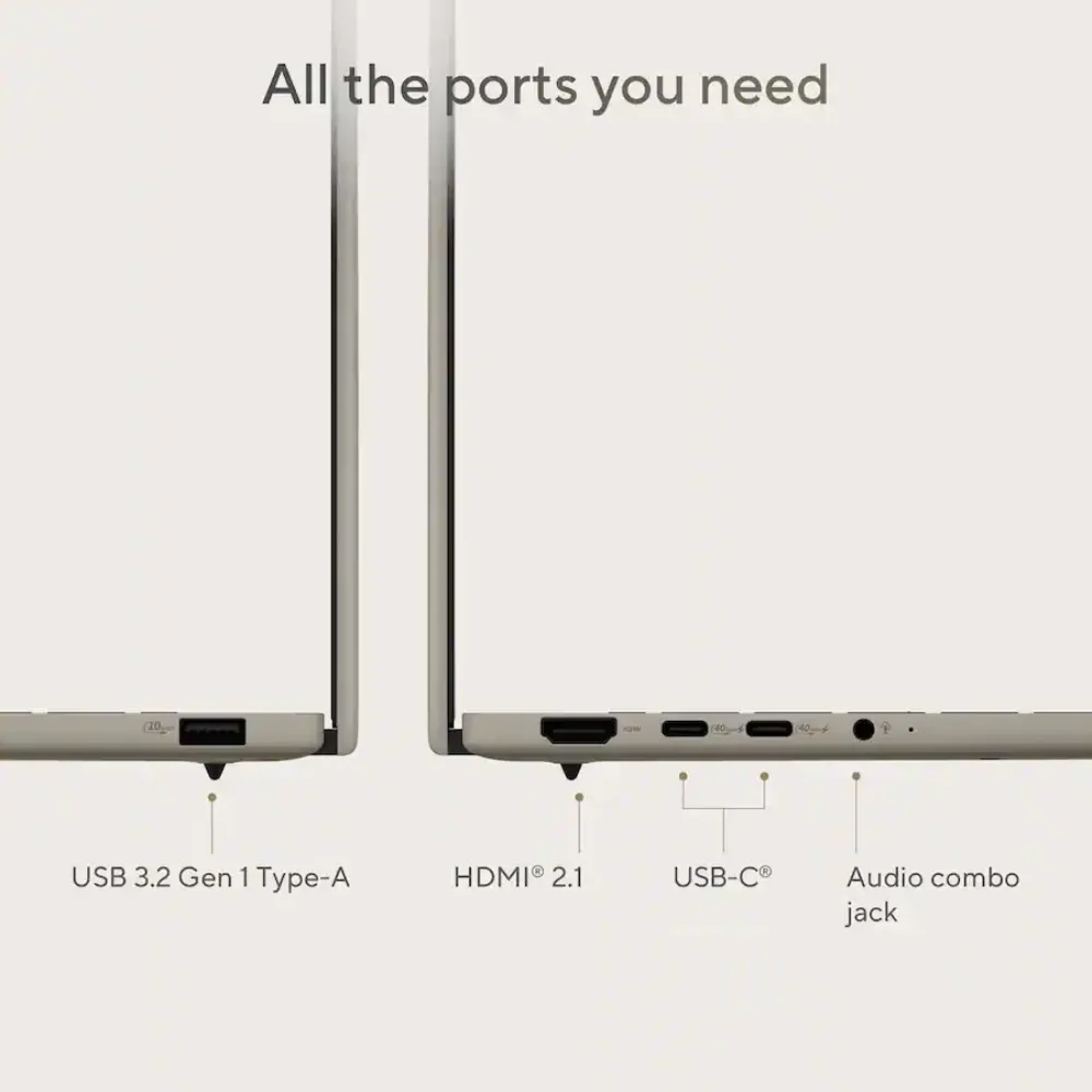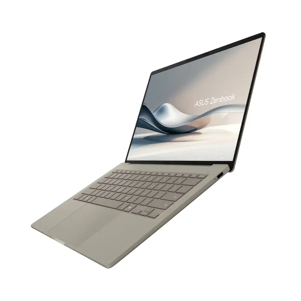 Portability is also a strong point. The Zabriskie Beige finish looks premium, and the ultra-thin 0.53-inch body keeps it bag-friendly. At about 2.4 lbs, the Zenbook 14 Snapdragon X Plus is easy to carry between classes, meetings, and flights.